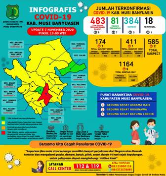 Sefti menambahkan, hingga 7 November 2020 ada sebanyak 483 kasus terkonfirmasi di Muba. “Diantaranya 384 kasus sembuh, 18 meninggal dunia, dan 81 masih dirawat,” terangnya.