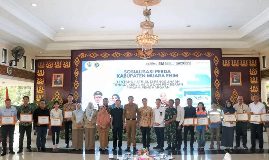 MUARA ENIM – Plt. Bupati Muara Enim, Ahmad Usmarwi Kaffah, S.H., LL.M., LL.M., Ph.D., memberikan penghargaan kepada 11 perusahaan pemberi kerja Tenaga Kerja Asing (TKA) di wilayah Kabupaten Muara Enim atas kepatuhan membayarkan Dana Kompensasi Penggunaan Tenaga Kerja Asing (DKPTKA) sebagai retribusi ke kas daerah.