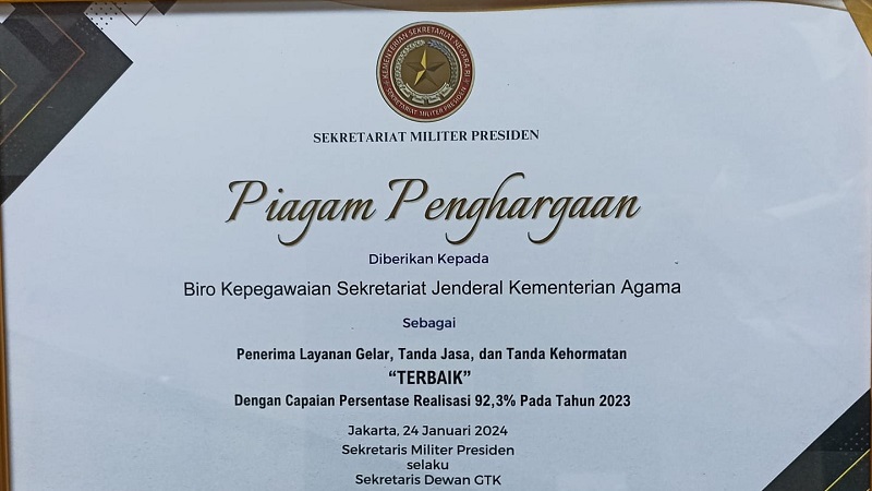 JAKARTA | Populinews – Biro Kepegawaian Sekretariat Jenderal Kementerian Agama menerima penghargaan dari Biro Gelar, Tanda Jasa, dan Tanda Kehormatan (GTK) Sekretariat Militer Presiden Kementerian Sekretariat Negara. Kemenag dinilai sebagai kementerian terbaik dalam capaian prosentase realisasi usul Satyalancana Karya Satya
