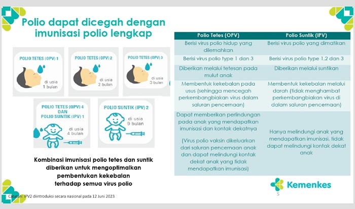 Direktur Pengelola Imunisasi Kemenkes dr. Prima menjelaskan, polio dapat dicegah dengan imunisasi polio lengkap. Imunisasi polio lengkap yang telah dimasukkan ke dalam program nasional terdiri dari dua jenis vaksin, yaitu vaksin polio yang diberikan secara tetes dan vaksin polio dengan suntikan.