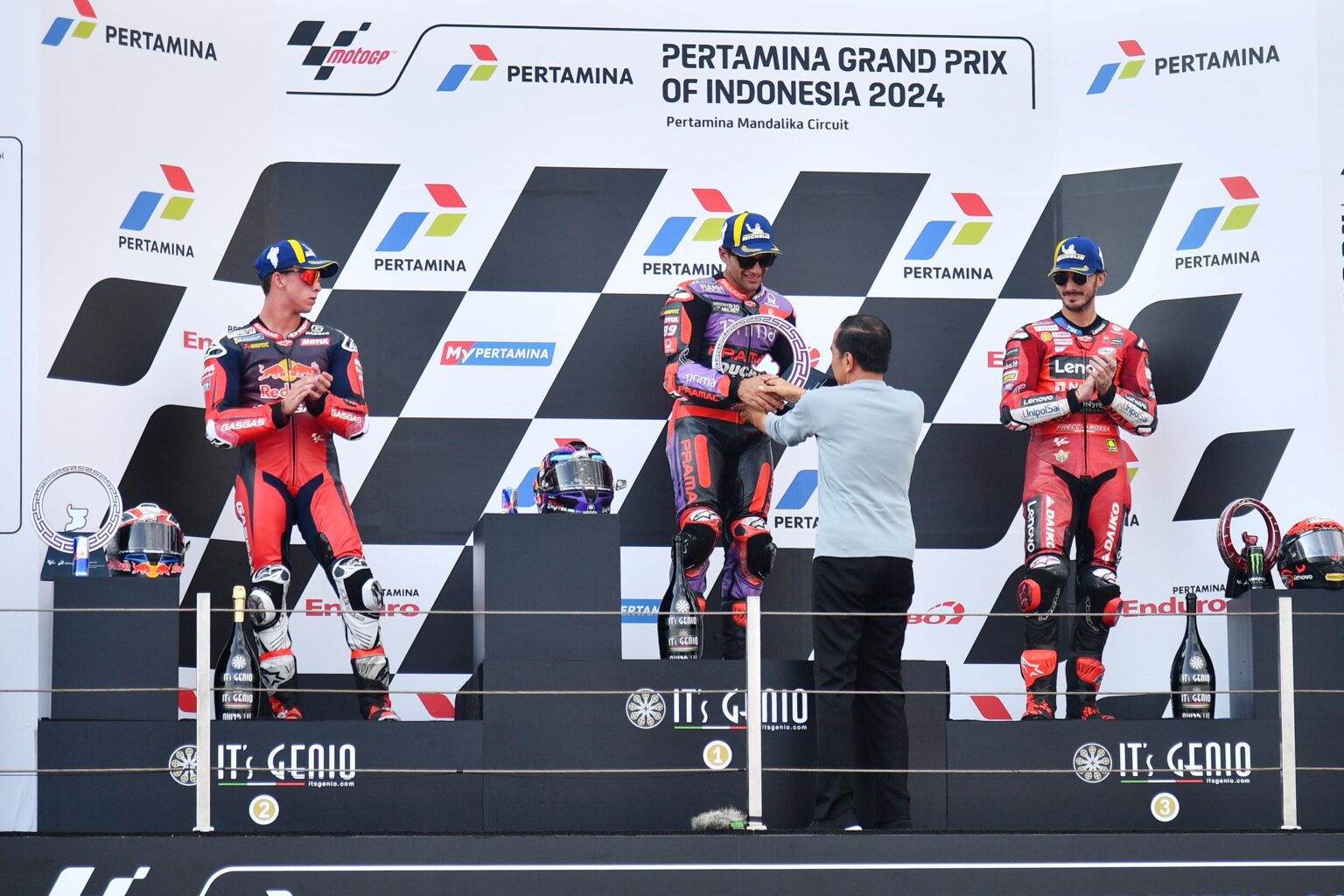 Sementara itu, Menteri BUMN Erick Thohir menyerahkan trofi kepada Pedro Acosta yang meraih posisi kedua. Sedangkan Menteri Pemuda dan Olahraga Dito Ariotedjo menyerahkan trofi kepada Francesco Bagnaia yang meraih posisi ketiga.