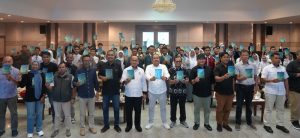 PANGKAL PINANG | Koranrakyat.co.id – Ketua Umum PWI Pusat H Zulmansyah Sekedang bersama-sama Ketua PWI Bangka Belitung Muhammad Fatthurrakhman Boy meluncurkan buku berjudul “Mengeja Laut” di Aula Pasir Padi Kantor Gubernur Babel, Sabtu (16/11/2024).