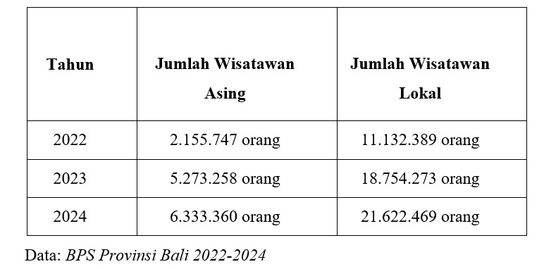 Bali merupakan mercusuar pariwisata Indonesia yang telah dikenal secara global. Tiap tahun jutaan wisatawan asing dan lokal datang ke Bali. Merujuk data BPS Provinsi Bali tahun 2024, jumlah wisatawan asing yang berkunjung ke Bali pada tahun 2024 berjumlah 6.333.360 orang, jumlah ini meningkat dari pada tahun 2023 yang hanya sebesar 5.273.258 orang.