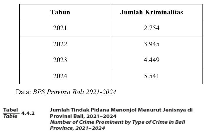 Peningkatan sektor pariwisata Bali di satu sisi memiliki dampak positif terkait ekskalasi perputaran roda ekonomi. Namun di sisi lain, juga terdapat dampak negatif yakni meningkatkan ekskalasi tingkat kriminalitas. Artinya tingkat ekskalasi wisatawan ke Bali bersifat similiar dengan meningkatnya tingkat kriminalitas di Bali. Berikut data kriminalitas di Bali pada tahun 2022-2023.