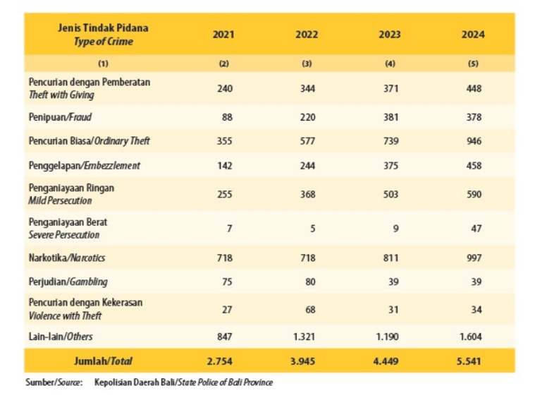 Selain itu, merujuk data Polda Bali, kejahatan yang dilakukan oleh warga negara asing juga terus meningkat dari tahun ke tahun. Data Kepolisian Daerah Bali menyebutkan, pada tahun 2024, 226 orang WNA ditangkap karena terlibat sebagai pelaku tindak pidana, baik umum, khusus, siber, dan narkoba.