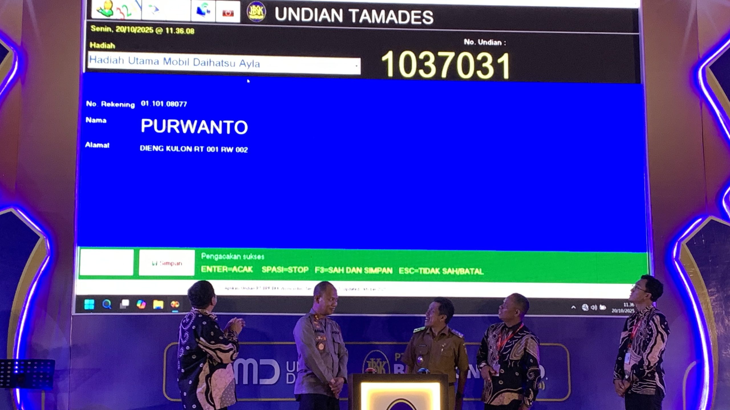 WONOSOBO | Populinews.com – Bupati Wonosobo, Afif Nur Hidayat, secara resmi membuka acara Pengundian Tabungan Masyarakat Desa (TAMADES) PT BPR BKK Wonosobo Tahun 2025, yang digelar di Gedung Sasana Adipura Wonosobo, Senin (20/10/2025).