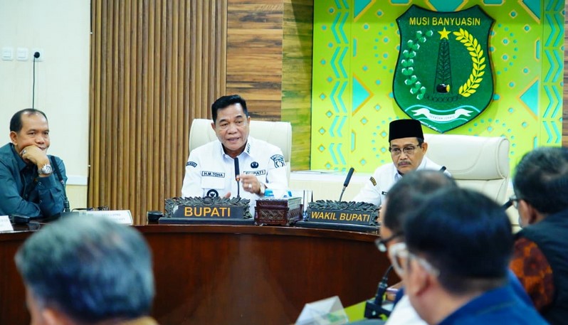 SEKAYU | Populinewas.com – Bupati Musi Banyuasin H. M. Toha Tohet, S.H didampingi Wakil Bupati Musi Banyuasin Abdur Rohman Husen bersama dengan Forkopimda Kabupaten Muba, melaksanakan rapat terkait dengan Penanggulangan Kegiatan Ilegal Drilling di Areal HGU PT. Hindoli, Rabu (11/3/2025) di Ruang Rapat Serasan Sekate.