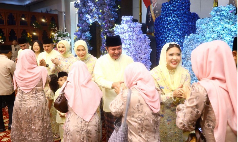 PALEMBANG | Populinews.com – Gubernur Sumatera Selatan Dr. H. Herman Deru kembali menggelar open house pada hari kedua Hari Raya Idulfitri 1447 Hijriah di Griya Agung, Minggu (22/3/2026). Kegiatan tersebut juga didampingi Ketua TP PKK Sumsel, Feby Deru.